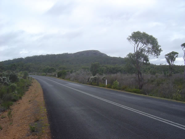 Windy Harbour, Mt ChudalupOur next trip was to Mt Chudalup. It is a massive 187m high granite outcrop seen here rising above the forest to the right of the road. It is known as a monadnock, which is a large isolated hill above a generally flat plain. Previous | Album | Next |